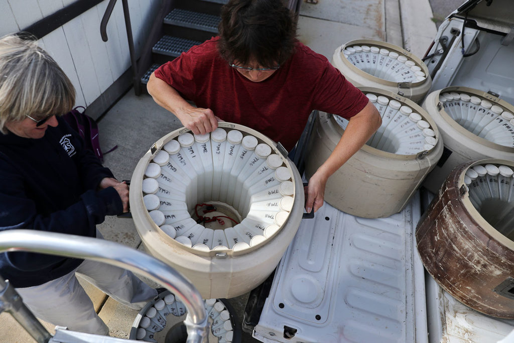 Left: Soil Lab measurements. Right: Biologists unload 24 days of water samples from the Tenderfoot Creek Experimental Forest at the Missoula Fire Sciences Laboratory.