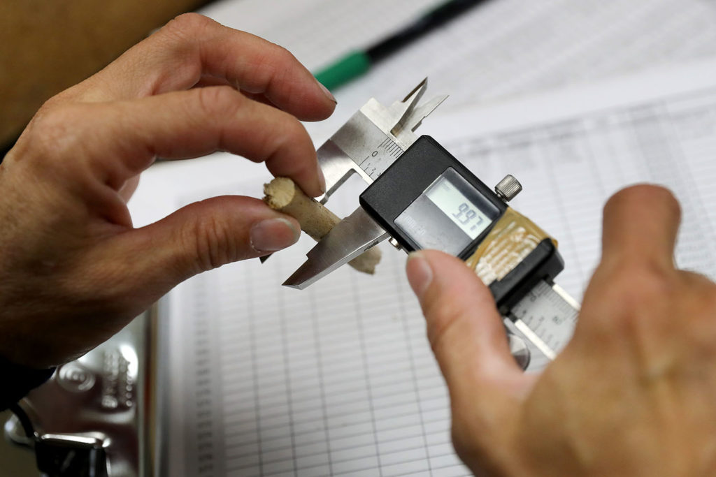 In the Soil Lab, Forest Service biological science technician Courtney Johnson measures the bulk density of sticks collected at sites across the Northern Rockies.