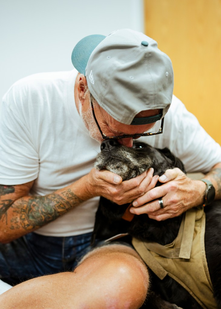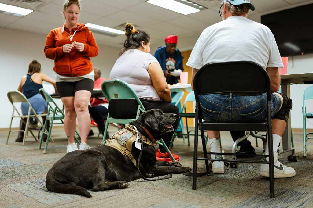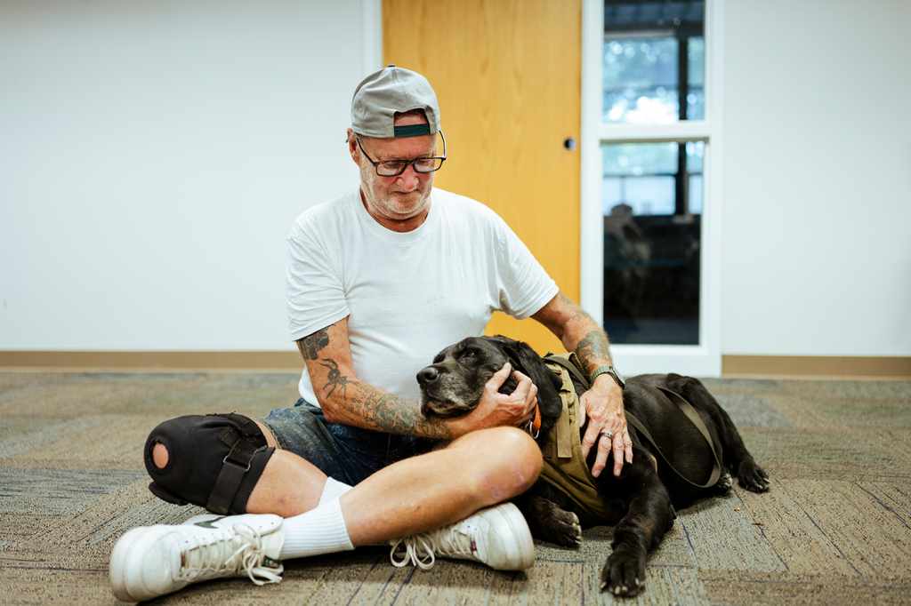 Jones pauses and clears his throat, wiping his eyes. “I get emotional about it,” he says quietly, looking down at the black Labrador retriever sleeping at his feet. “Midnight has done so much for me. I really don’t know what I’d do without him.”