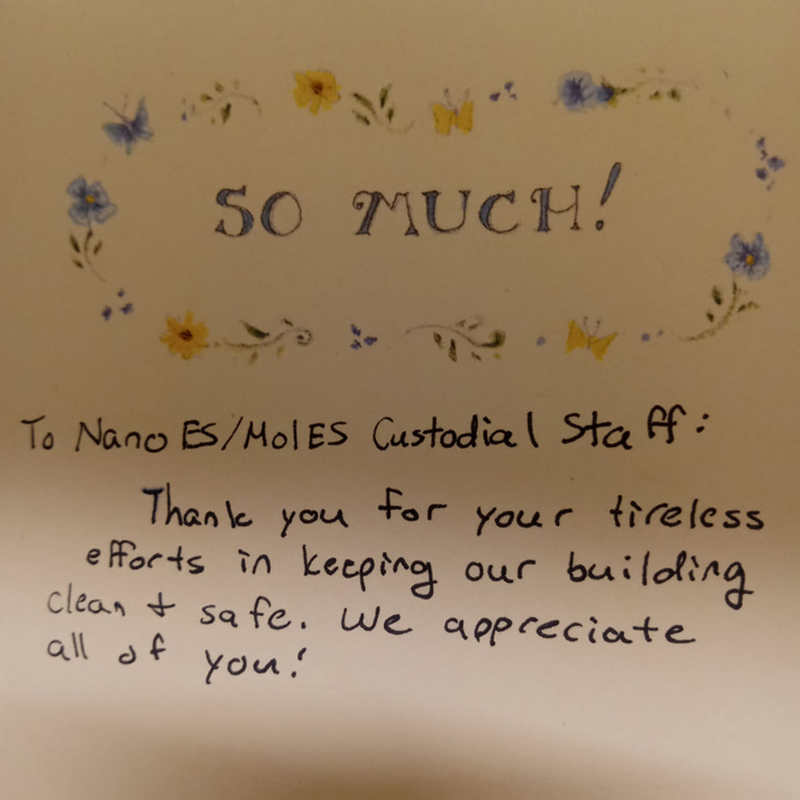 Happy Clients Make Custodians Smile, 2020. “She wanted to let me know that the department is pleased with all of my hard work in keeping them safe during this pandemic. She also mentioned to me that my smile every day is so contagious.” —Shirley H. Photo courtesy of Shirley H.