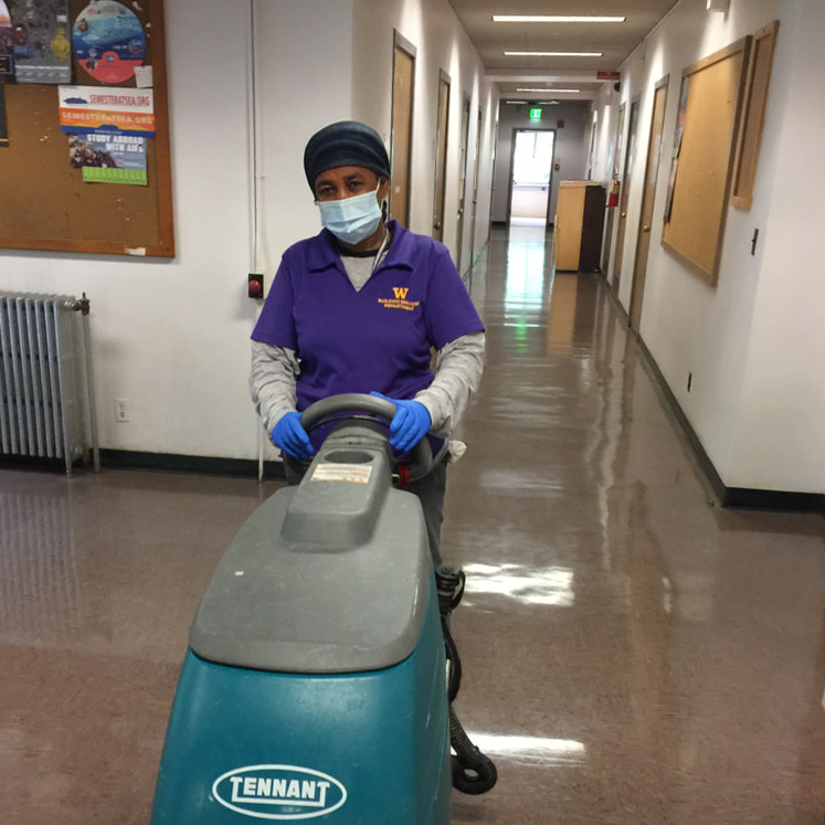 The coronavirus pandemic sparked the idea of “essential workers”—those whose jobs were so crucial to the ongoing functioning of the economy and of our collective well-being that they were exempt from quarantine rules. Sadly, essential workers—like the custodians who ensure that work spaces are regularly cleaned and maintained—have also long been exempted from equitable pay, a strong enforcement of health and safety standards, and the dignity they deserve. Disproportionately low-income immigrants and people of color, custodial workers’ rights are a matter of racial justice, as Evalynn Romano, the daughter of University of Washington custodians, outlines in her analysis. This photo essay captures the hard work and dignity of UW custodians.