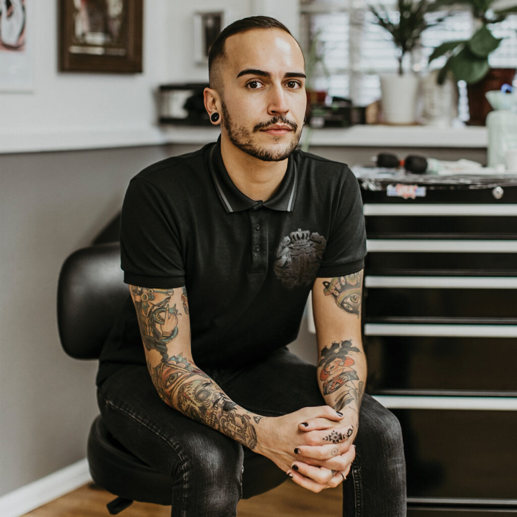 “I couldn’t really imagine doing anything else,” says Tanner Minock, who identifies as a queer Colorado Xicano and co-owns Denver-based Two Thunders Tattoo. Minock, like many tattooers, has adorned his own body with myriad works of art. He got his first tattoo at age 16, with his mother’s permission, and jokes that “it’s her fault that I’m doing this right now.”