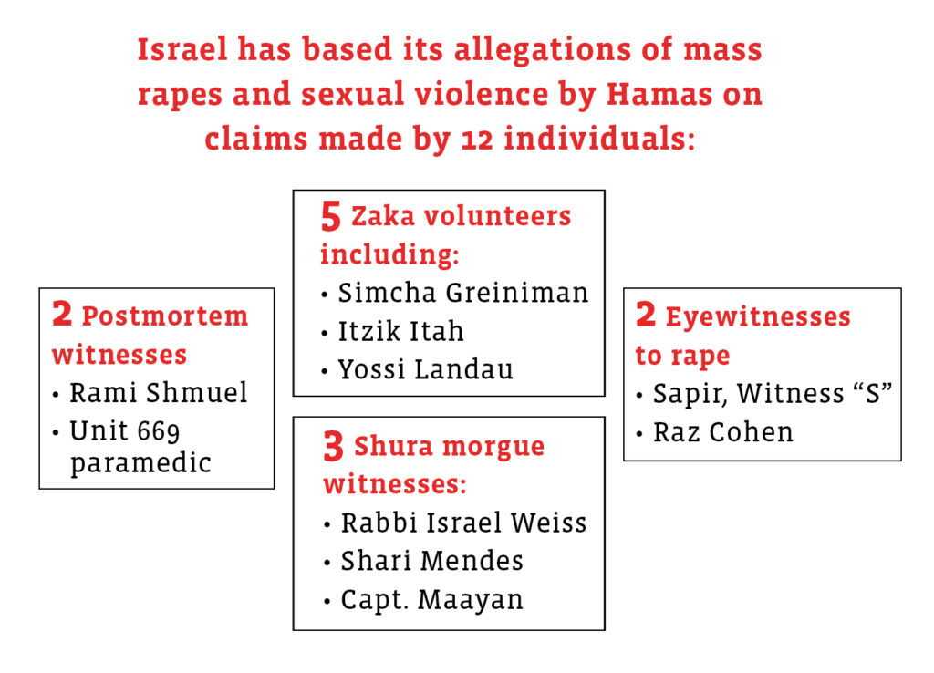 All but one of the 12 sources are connected to the Israeli military and police, such as the Home Front Command. Five of the sources are Zaka volunteers who told stories that smack of fabrications. Five other sources claimed they saw corpses that bore signs of rape or sexual violence. Not one of these sources was professionally trained to make such assessments, and nearly all fabricated stories, as described below.